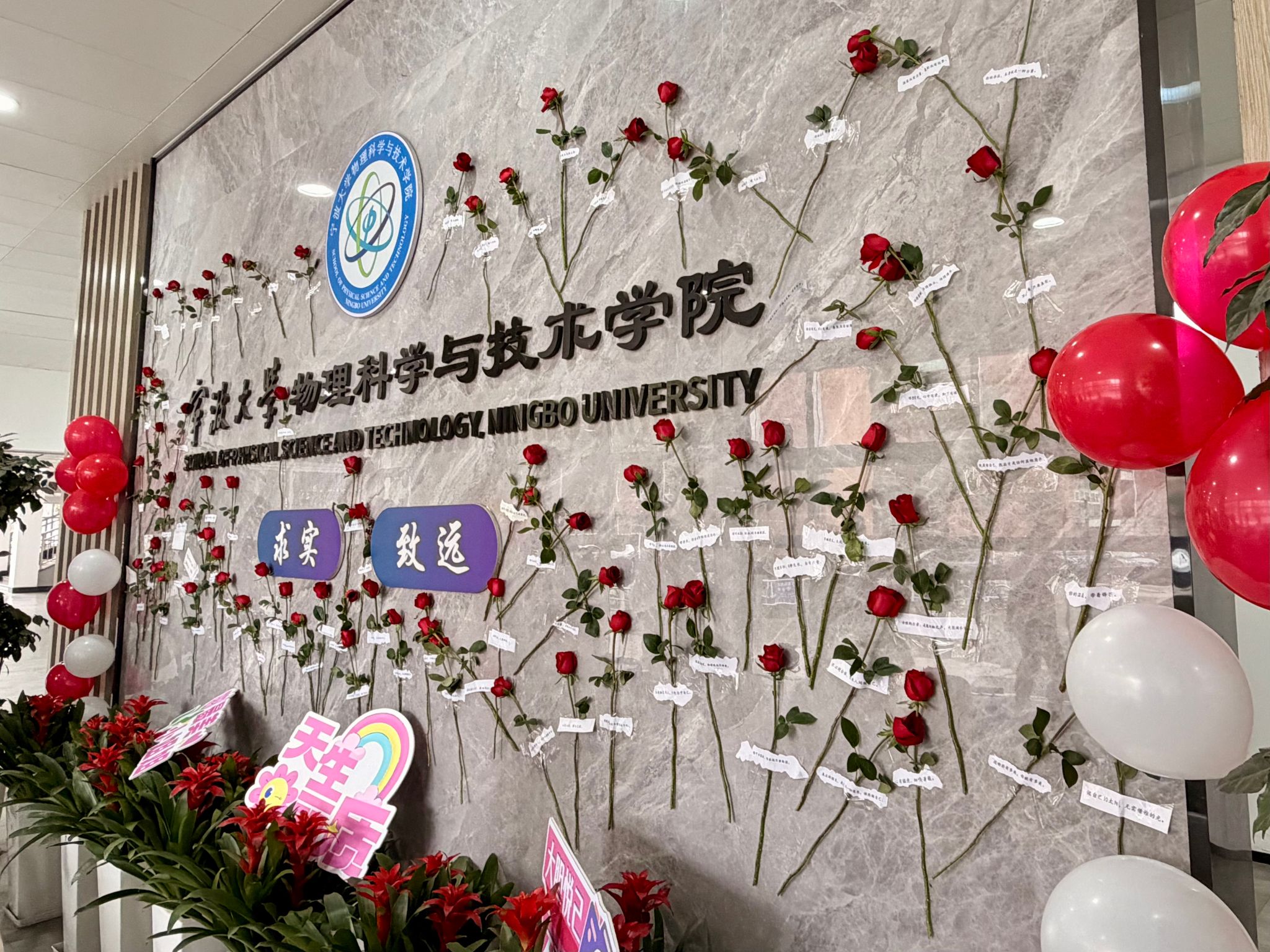 在大厅入口处设置的“心花墙”前,陆续有师生驻足,现场准备了100束玫瑰花,参与者取一朵玫瑰带走祝福,同时留下一封以“亲爱的自己”开头的书信。信件可张贴于心花墙上,也可自行保留。短短一小时,100束玫瑰全部送出,心花墙上贴满了手写的温情寄语。