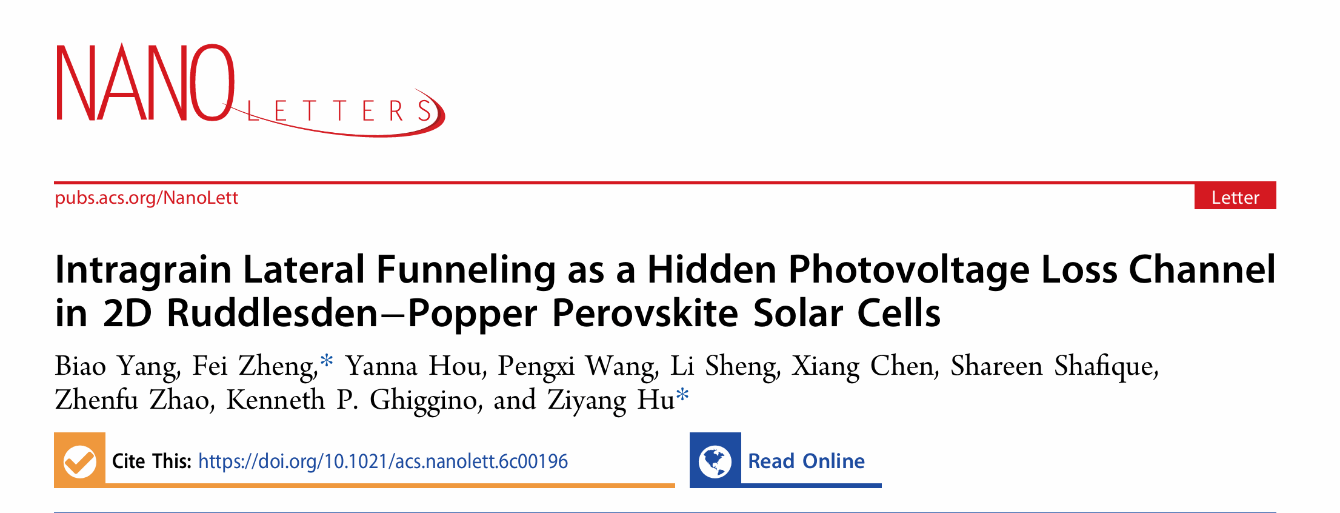 近日,女同av 郑飞教授与胡子阳教授团队在二维钙钛矿太阳能电池光电压损失机制研究方面取得重要进展,相关成果以研究论文 “晶粒内部横向输运作为二维Ruddlesden–Popper型钙钛矿太阳能电池中隐藏的光伏电压损失通道” 发表在国际权威期刊《纳米通讯》(Nano Letters)上。女同av 硕士研究生杨彪为论文第一作者,郑飞、胡子阳为通讯作者,合作者包括澳大利亚墨尔本大学的Kenneth P. Ghiggino教授。