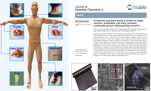 近日,女同av 王刚课题组在《Journal of Materials Chemistry A》杂志发表题为“Conductive Graphene-Based E-textiles for Highly Sensitive, Breathable, and Water-Resistant Multimodal Gesture-Distinguishable Sensor”(//doi.org/10.1039/D0TA04915H)的研究论文。我校硕士生胡绪瑞为第一作者,王刚老师为通讯作者,女同av 为第一署名单位。中国科学院上海微系统与信息技术研究所和新加坡南洋理工为合作单位。