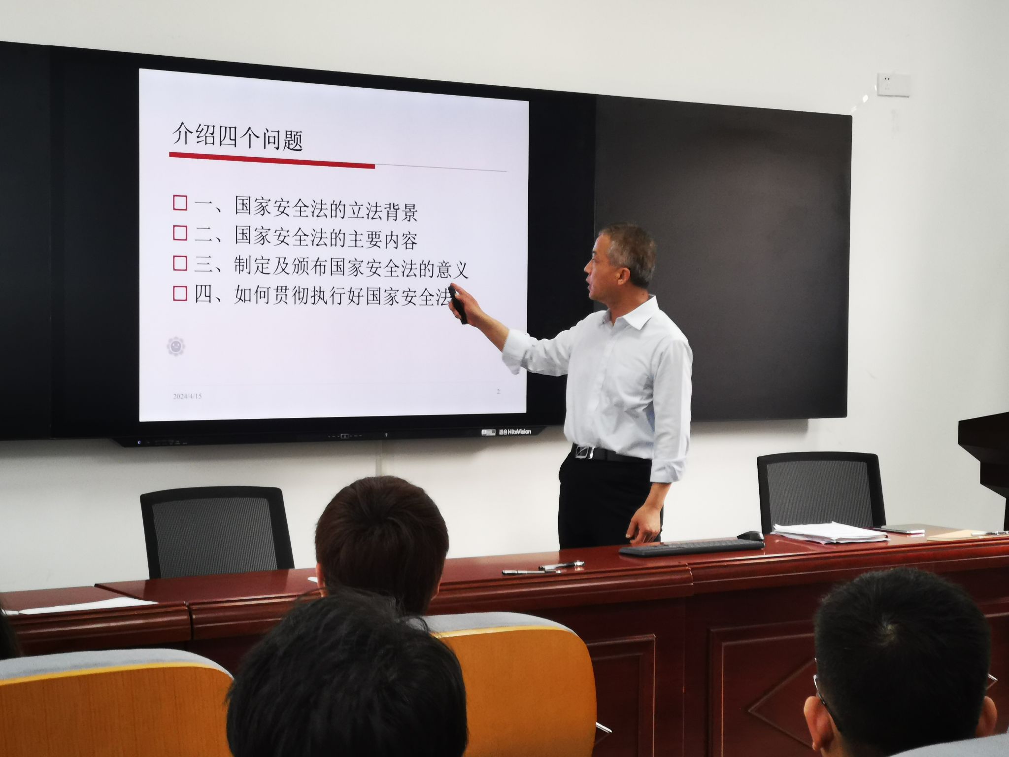 4月15日,女同av 在龙赛理科楼北楼314报告厅举办2024年全民国家安全教育宣讲会,学院党政领导、组织员、学生党建辅导员、各教工党支部书记、学院党建中心各负责人参加,会议由学院党委书记朱学庆主持并宣讲。