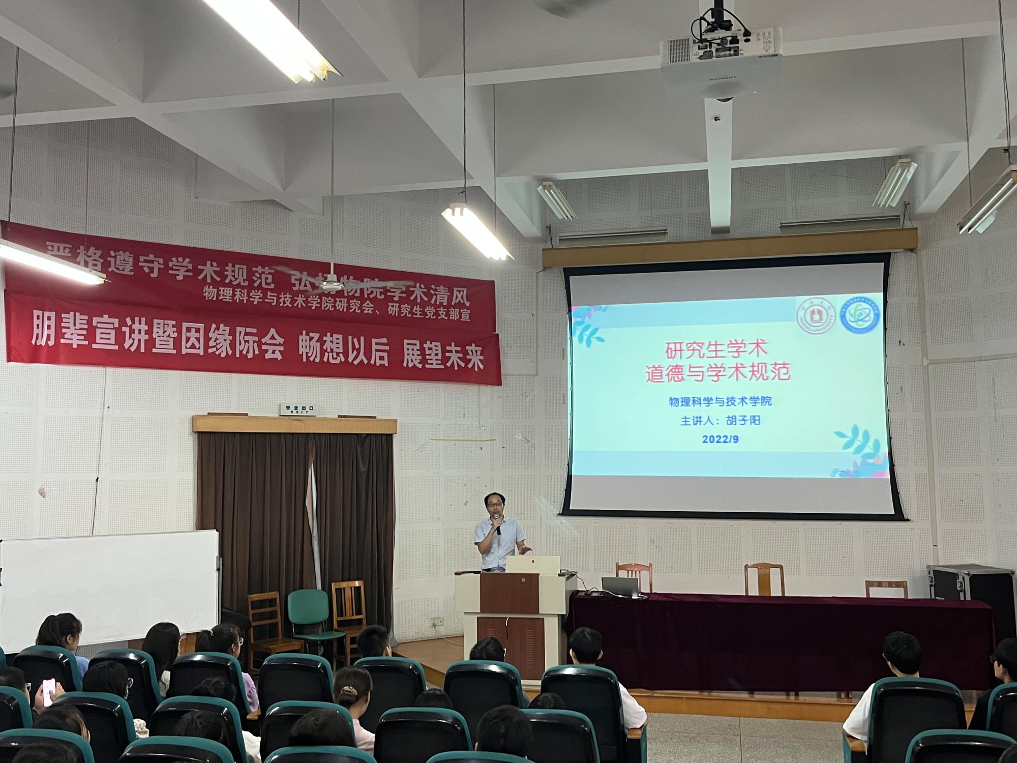 为进一步加强物院研究生学术道德建设,遵守科学道德和学术诚信,杜绝学术不端行为,营造良好的学术氛围和制度环境。923日,物理学院在龙赛报告厅举行“严格遵守学术规范、弘扬物院学术清风”为主题的讲座活动。本次活动特别邀请了党委委员胡子阳教授进行讲座,22级硕士新生参加此次活动。