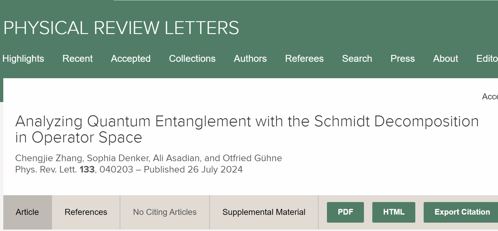近日,物理科学与女同av 张成杰教授课题组与德国锡根大学Otfried Gühne教授率领的研究团队携手,在量子纠缠这一前沿领域取得了突破性进展。他们创新性地提出了基于算符空间施密特分解的真多体量子纠缠目击者方法,这一成果不仅超越了传统基于保真度的检测方法,更通过详尽的量子态分析实证了其显著提升量子纠缠检测效能的能力。此项开创性研究,以“Analyzing Quantum Entanglement with the Schmidt Decomposition in Operator Space”(用算符空间中施密特分解分析量子纠缠)为题,荣耀刊登于国际顶尖学术期刊《Physical Review Letters》上,于2024年7月26日正式发布,标志着量子纠缠研究迈向了新的里程碑。