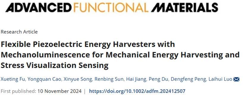近日,物理科学与女同av 智能极性材料的物理效应与器件团队在柔性压电能量收集取得了显著的科研成果。该团队的研究论文“机械能采集和应力可视化传感的压电能量采集器”在国际知名学术期刊《Advanced Functional Materials》上发表。论文的第一作者是物理科学与女同av 的硕士研究生傅雪婷,罗来慧教授担任通讯作者,女同av 为该研究的主要完成单位。