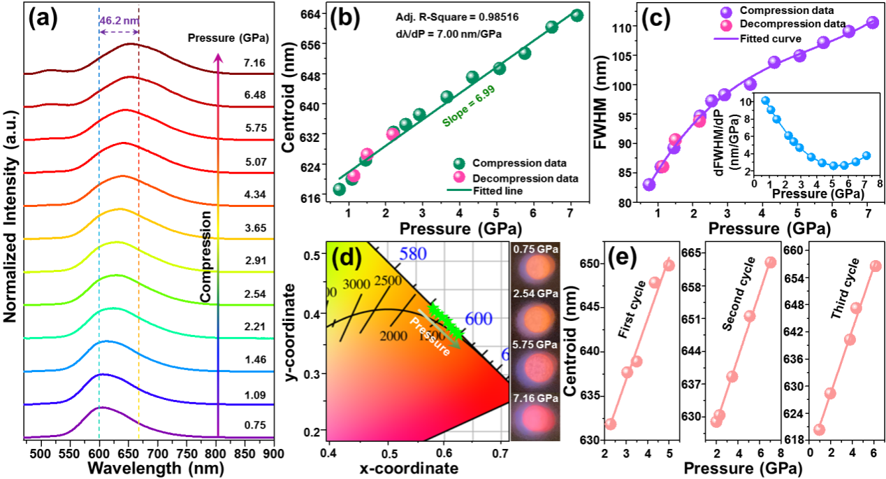 近年来,稀土/过渡金属掺杂发光材料由于其独特的光学特性而被广泛应用于白光LED、光学温度传感、光催化、压力检测等领域。其中,荧光检测因其具有分辨率高、非接触、相应速度快等优势,而被大量研究。近年来,荧光压力传感因其具有非接触、响应速度快、高分辨等优势而被广泛研究,其中红宝石(Al2O3:Cr3+)作为商业化产品而备受青睐。然而,红宝石具有灵敏度低(dλ/dP = 0.365 nm/GPa)、高压荧光猝灭等缺陷,限制其进一步的使用推广。针对上述问题,女同av 陶瓷发光实验室以Mn2+掺杂NaY9(SiO4)6O2红色荧光粉为研究对象,获得了具有高效率的压敏发光材料。