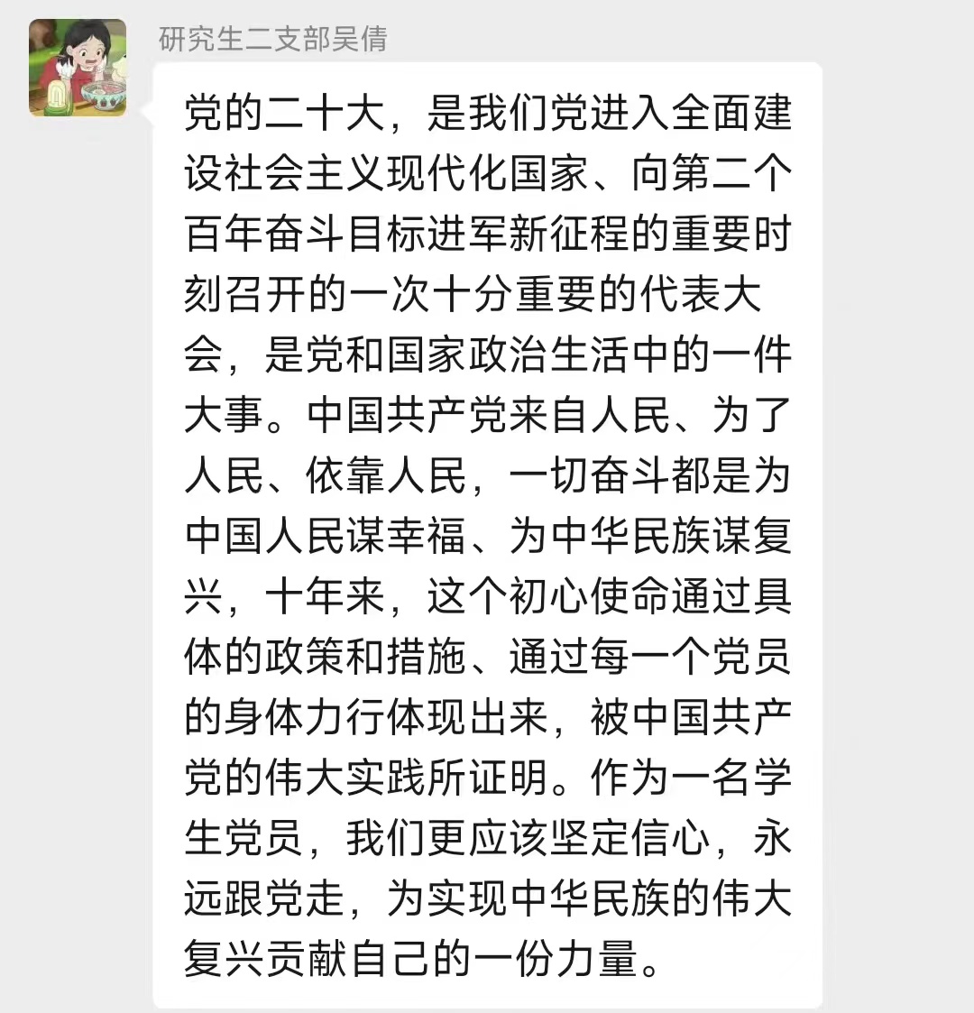 “我将认真学习二十大精神并牢记于心,紧跟党的步伐,听党指挥,为党和人民奋斗。脚踏实地,埋头苦干,奋勇前进,认真且努力塑造一个全新的自己,努力成为党和国家真正所需的真诚儿女。”“我要心存使命感与担当,跟随时代的步伐去努力实现中华民族伟大复兴的光荣使命!”“作为学生党员,我们应该做到坚定不移跟党走,不断提高自身理论素养,掌握建设中国特色社会主义的本领,始终走在时代前列,与时俱进。”与会的党员同志们纷纷在新媒体平台留下自己的所思所想。