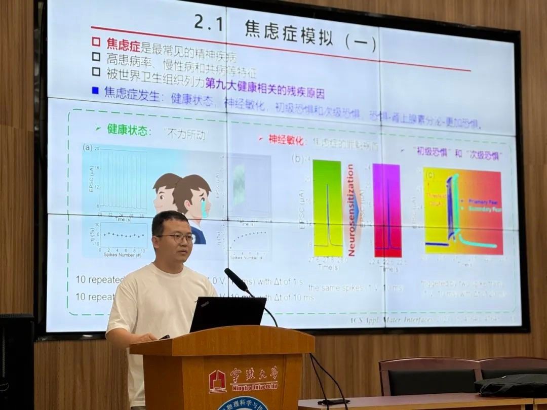 在随后的报告中,王伟胜从理论研究到实验实现,层层递进地分析了生物突触功能模拟及其在智能感知平台中的重要性。他还展示了团队的阶段性科研成果,包括发表了多篇高水平SCI论文,并申请了一项国家发明专利,为与会者提供了宝贵的经验分享。