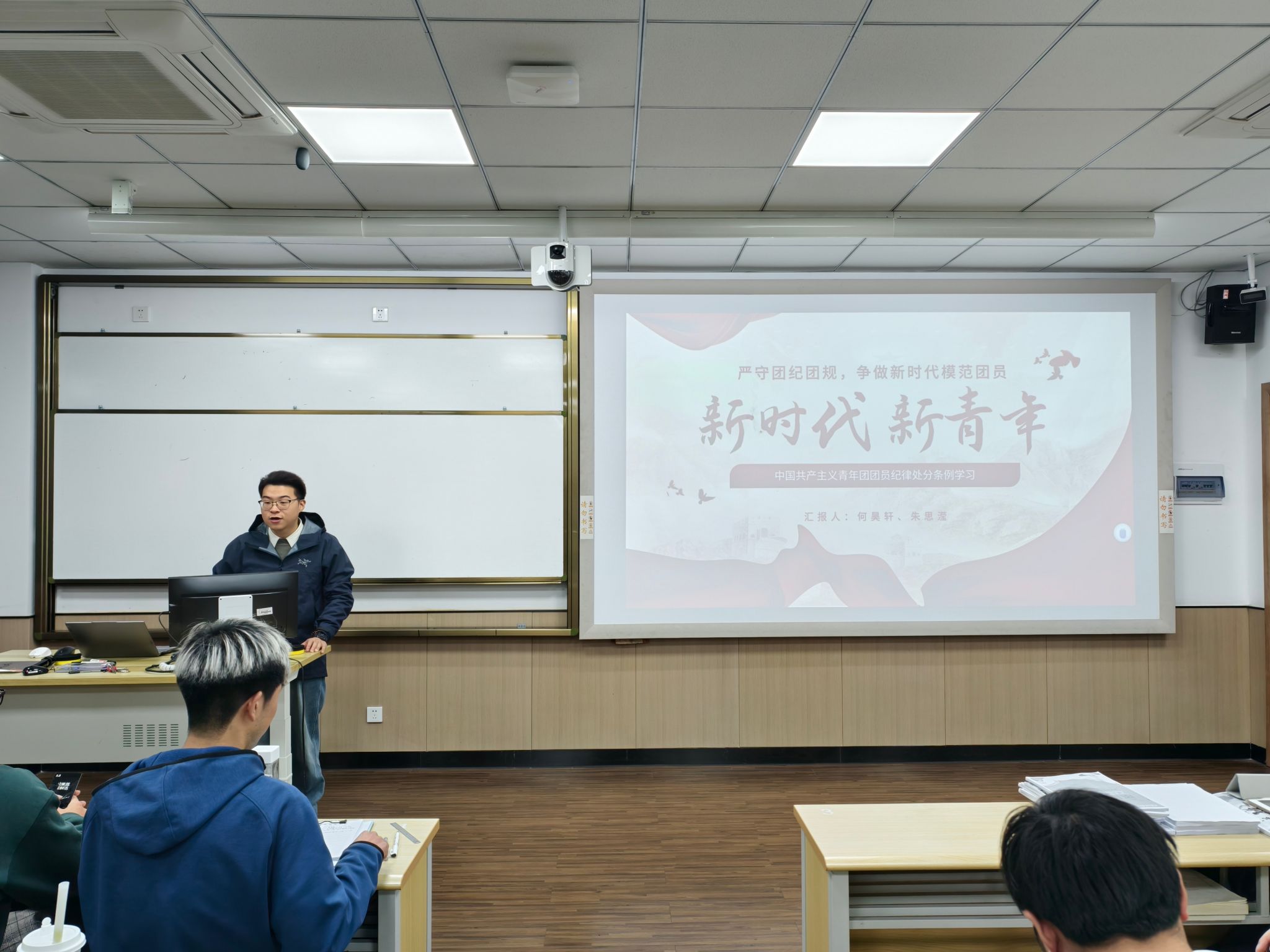 共学规章,强化纪律意识。活动伊始,张锡炜老师从晚归、不归现象谈起,明确了学校请假与考勤管理规定,重点阐述了请假审批流程和违纪处理办法。张老师以一个个发生在同学们身边的案例入手分析,希望以案为鉴,帮助同学们筑牢纪律防线。