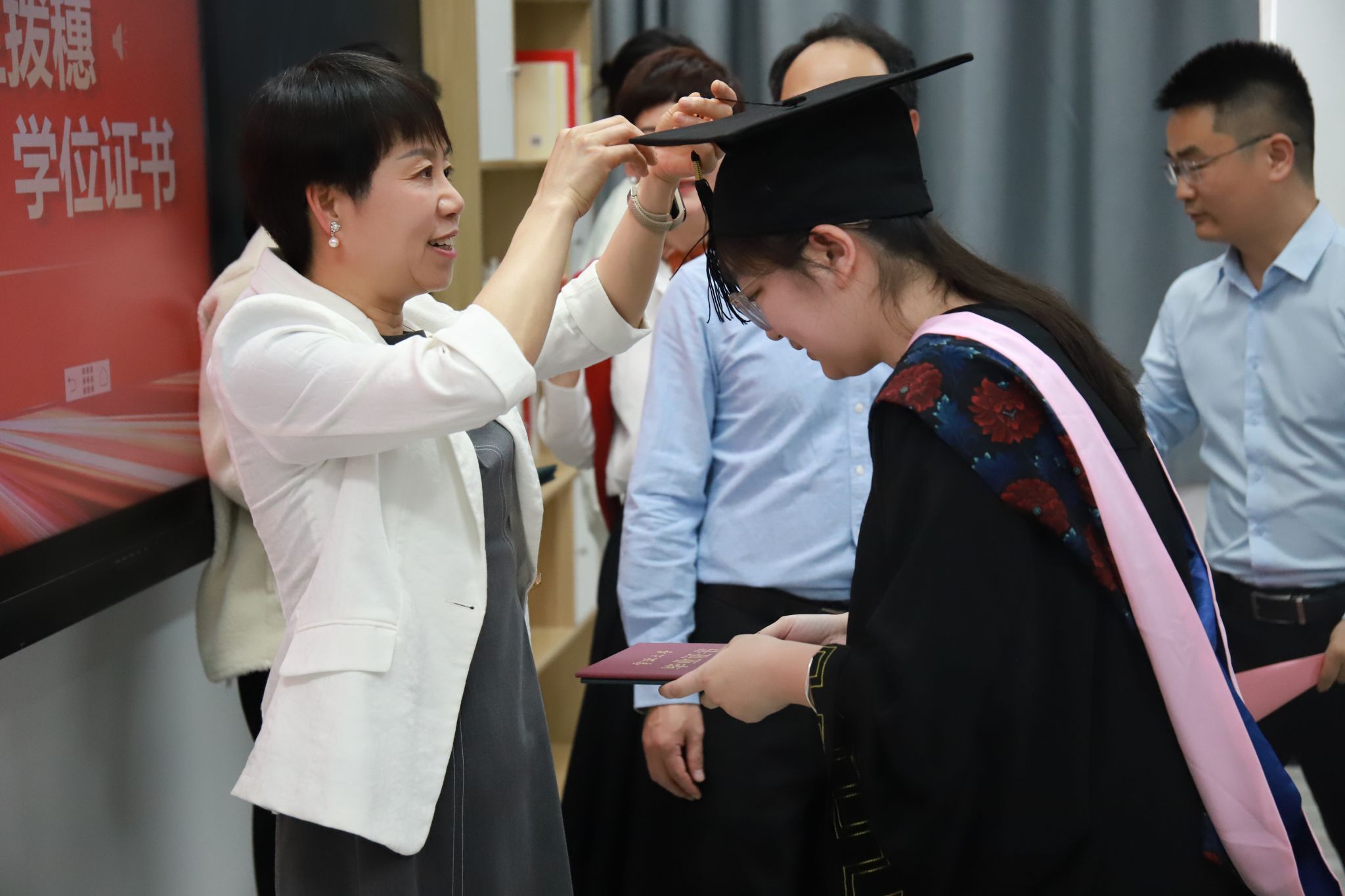 在庄严的国歌声后,负责本科教学的副院长胡子阳郑重宣读了毕业生名单。随后,执行院长段香梅等女同av领导为每位毕业生拨正流苏、颁发证书,这个传统仪式的每个动作都饱含深意——流苏从右至左的轨迹,恰似这些学子曲折却坚定的求学之路。那本沉甸甸的毕业证和学位证,记录着他们突破"学术势垒"的每一个关键参数。这一特殊的仪式不仅是对5位同学永不言弃精神的最好肯定,也象征着他们即将开启人生新的篇章。