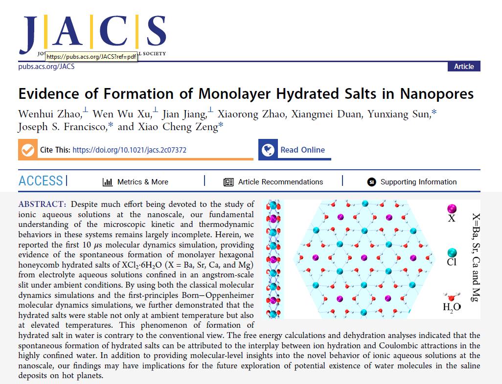 计算物质科学团队赵文辉和孙运祥副教授及许文武教授携手香港城市大学曾晓成教授,美国科女同av院士宾夕法尼亚大学Joseph S. Francisco讲席教授(美国科女同av院士),在纳米限域环境内离子水溶液研究方面取得新进展,相关研究论文以“Evidence of Formation of Monolayer Hydrated Salts in Nanopores”为题发表在国际著名期刊J. Am. Chem. Soc.上,宁波大学为第一单位和第一通讯单位。纳米限域环境内受限溶液表现出不同于宏观体系的结构和动力学特征,...