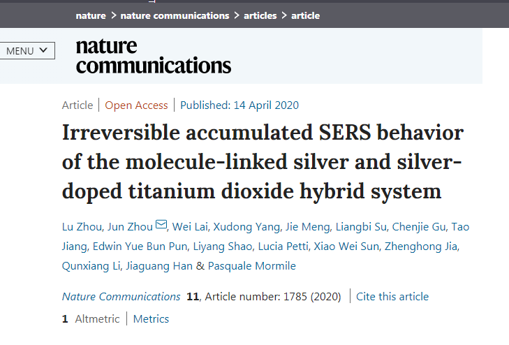 4月14日,我院周骏教授课题组在Nature子刊《Nature Communications》杂志发表题为“Irreversible accumulated SERS behavior of the molecule-linked silver and silver-doped titanium dioxide hybrid system”的研究论文。我院硕士周露为论文第一作者、周骏教授为通讯作者,宁波大学为第一署名单位,该项成果的发表体现了我校科研工作新的突破和发展。 该论文基于自主设计和制备的分子链接银与掺杂银的二氧化钛杂化体系,观测...